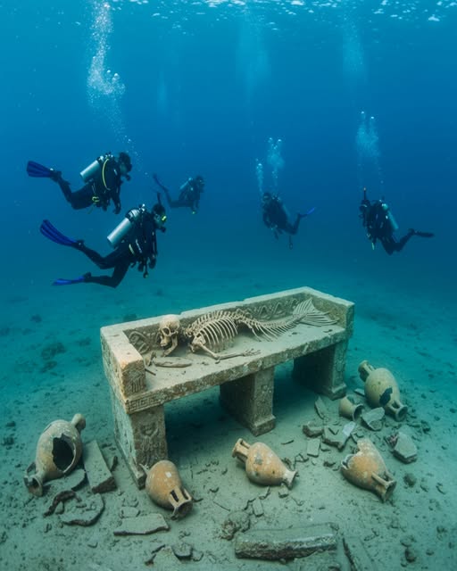 Divers off Malta’s coast have uncovered a discovery that could rewrite history — a perfectly preserved mermaid skeleton resting on a carved stone bench, surrounded by ancient amphorae and coral formations. This astonishing find challenges everything mainstream archaeology has told us.